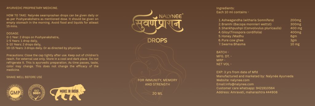 Nalynee Swarnaprashan Drop For Kids –  Natural Formulated with Pure 24 Ct Gold.    Healthy Growth , Golden Nector , Improves Strength & immunity Booster                          For KIds (0-16 Years). Suvarnaprashan is one of the sixteen essential “Sanskara” for children. It is an age old and time-tested method of Immunization.