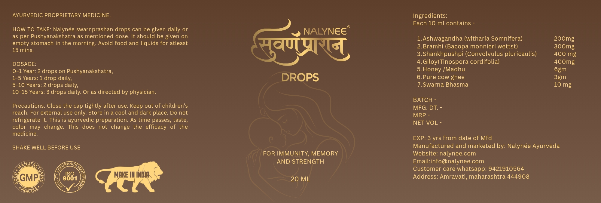 Nalynee Suvarnaprashan Drops is formulated with 24CT Suvarna Bhasma. All the ingredients are carefully mixed together to ensure that every single drop contains herbs that support the overall healthy development of a child.